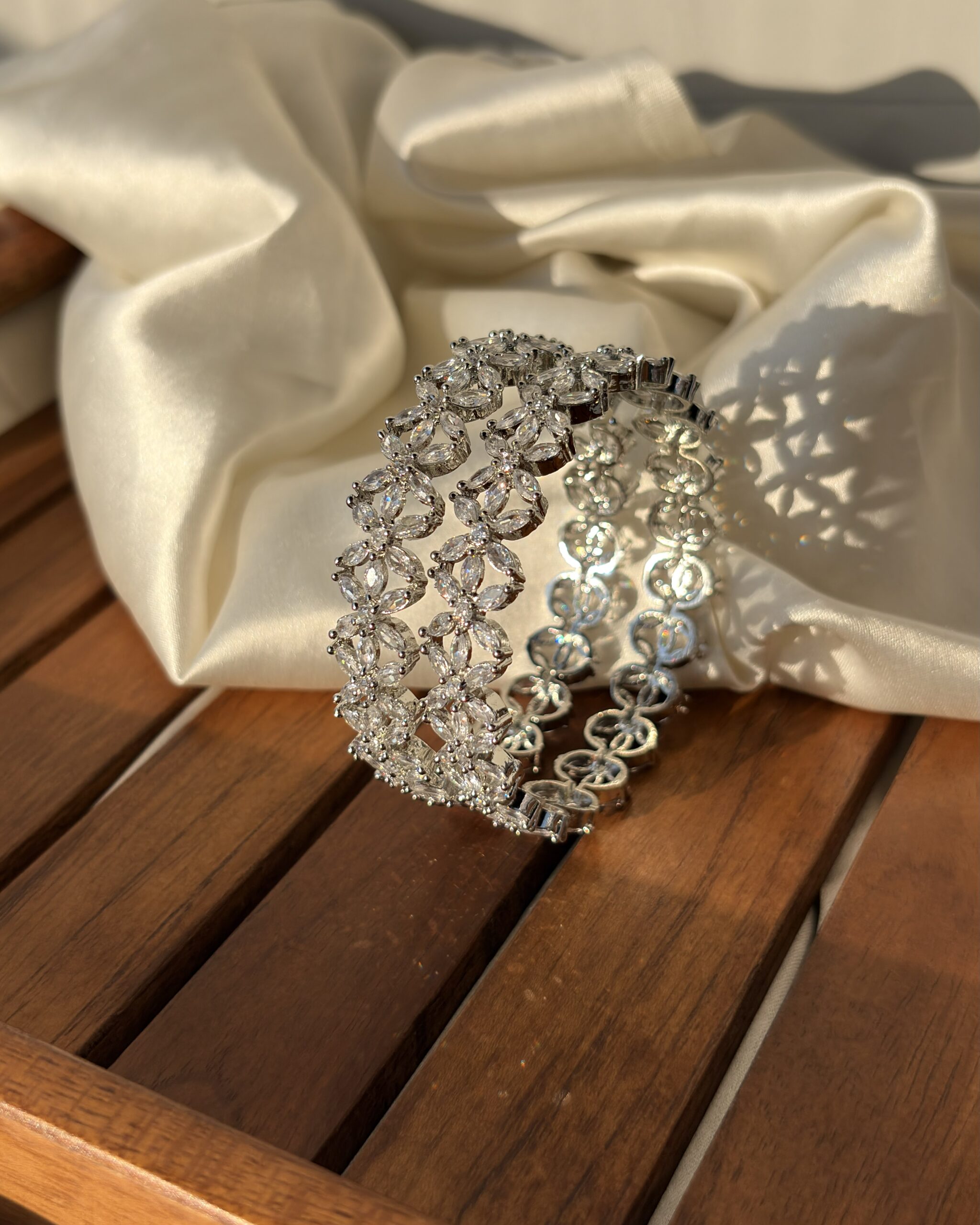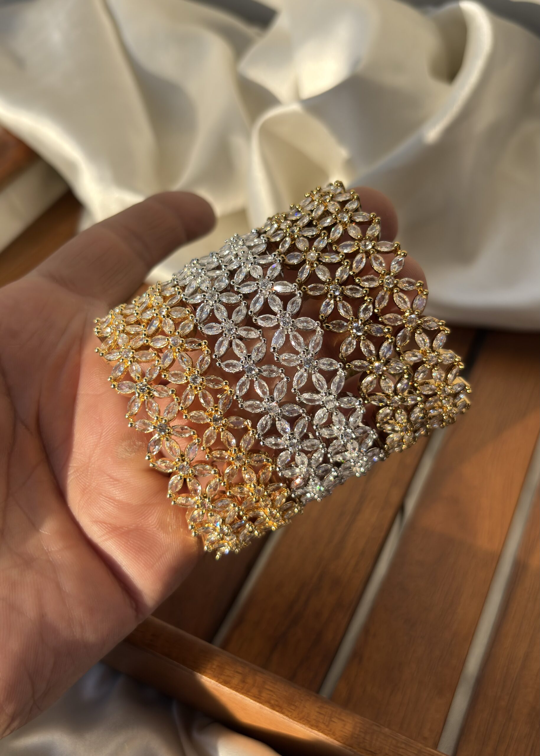 Add timeless elegance to your jewellery collection with this exquisite American Diamond Bangle, designed to radiate sophistication and charm. Featuring intricately arranged floral patterns studded with premium-quality American diamonds, this bangle offers a brilliant sparkle that beautifully complements its rich gold-tone base.
