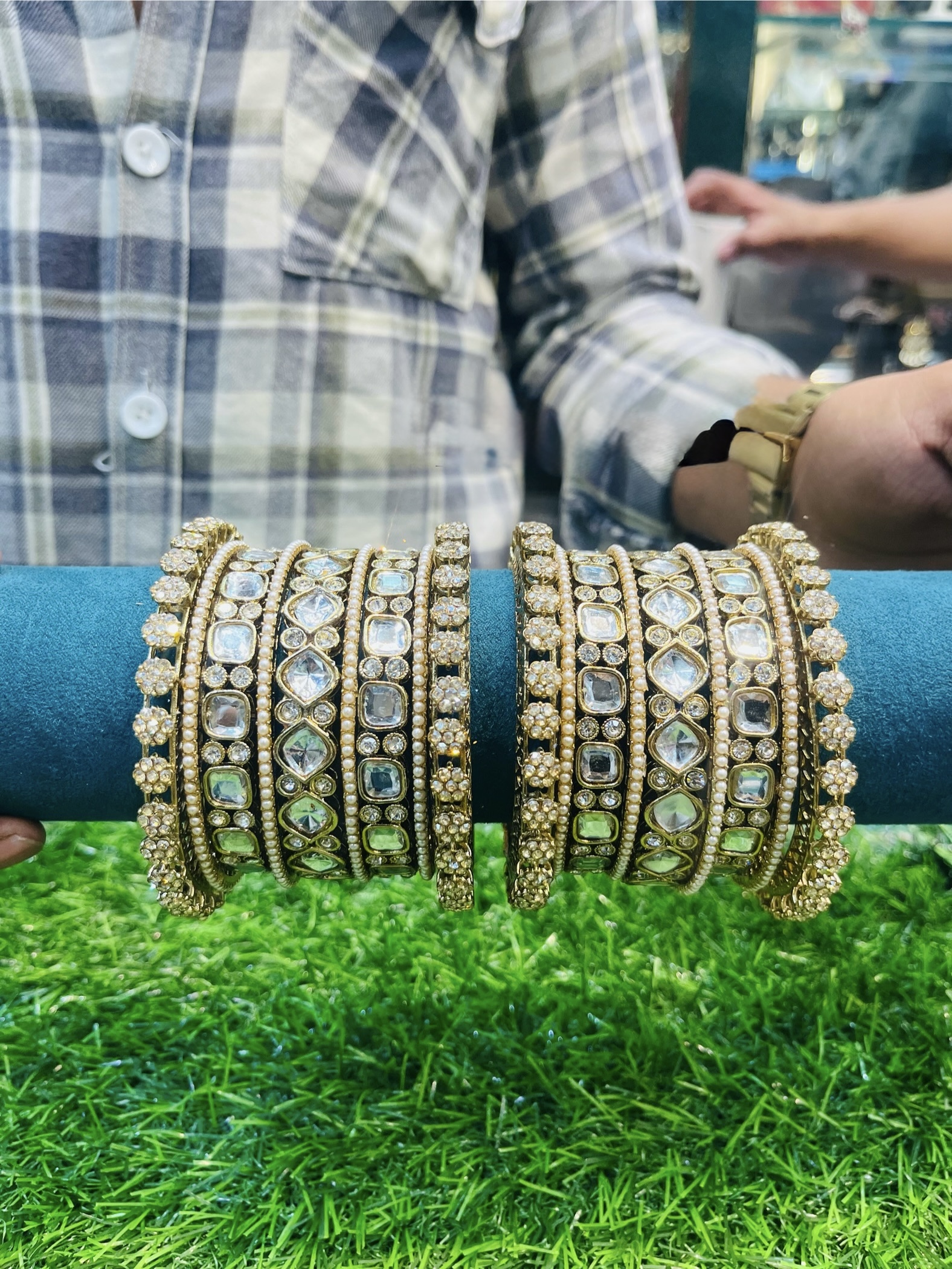 Elegant handcrafted bridal bangle set with intricate stone and pearl work, available in any color to match your outfit perfectly. Ideal for weddings, parties, and festive occasions.