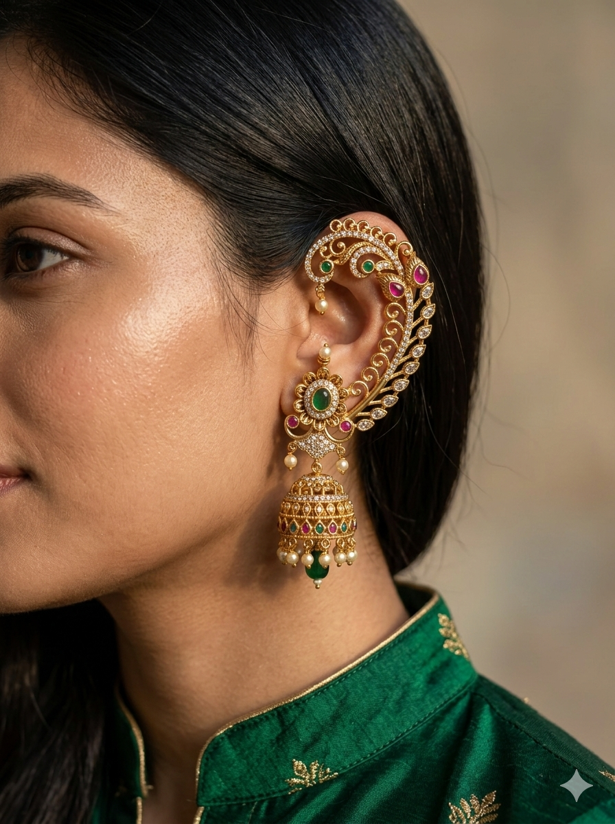 Perfect for bridal wear, festive celebrations, and grand occasions, these statement earcuffs elevate traditional sarees, lehengas, and silk ensembles effortlessly. Designed to stand out while maintaining elegance, they are a true celebration of classic Indian jewellery artistry.