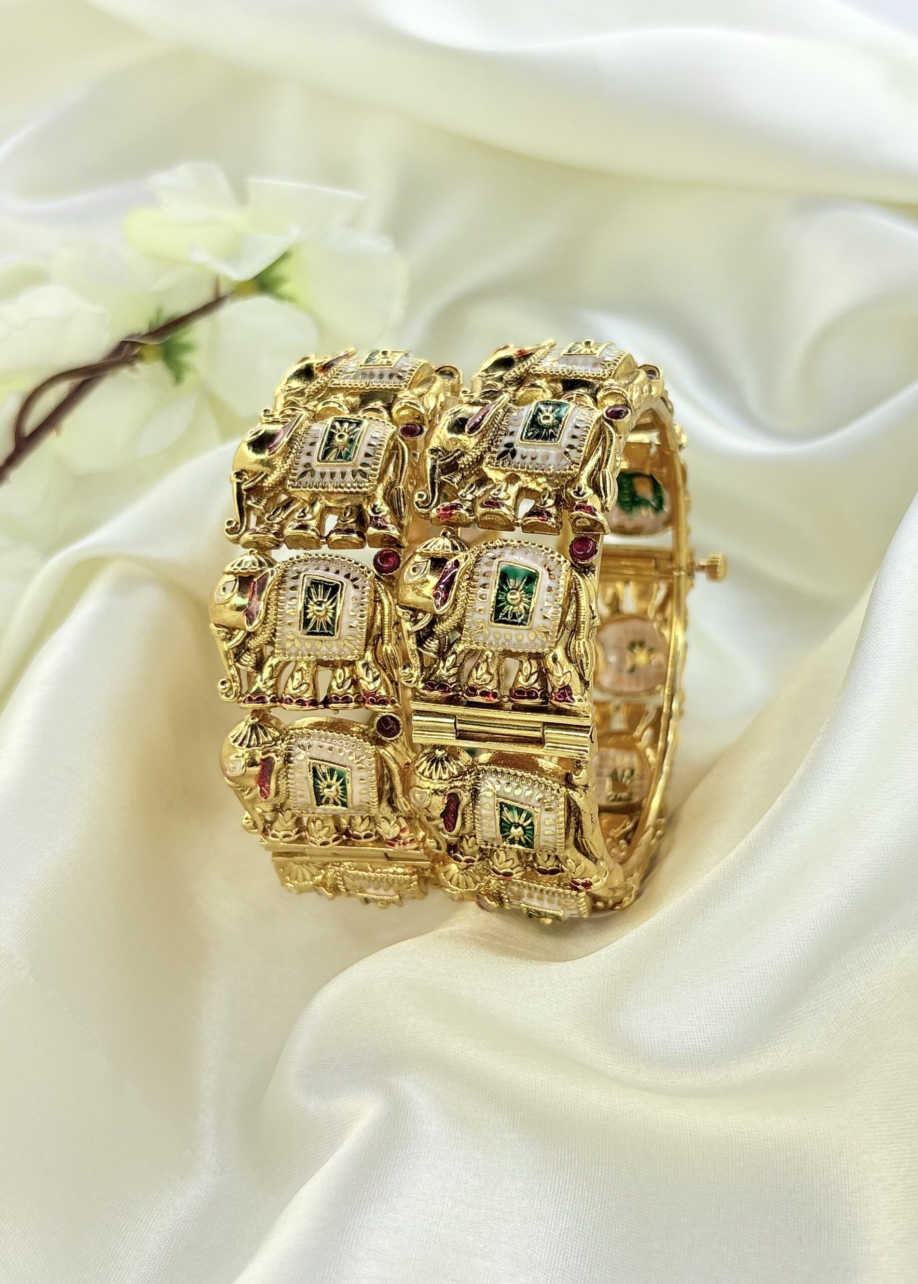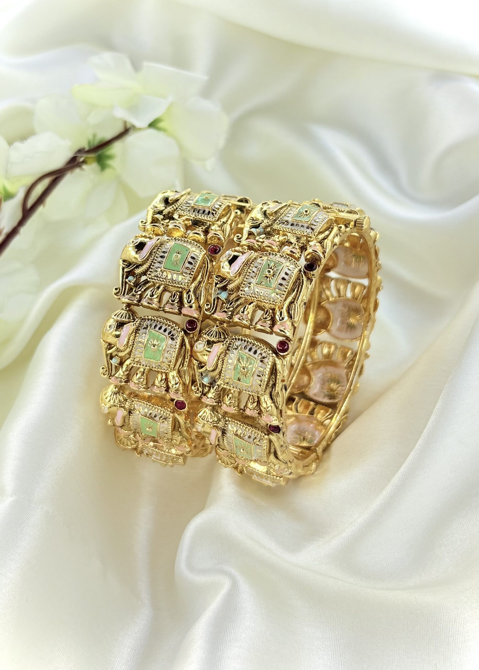 Featuring traditional screw fastening for a secure fit, these bangles showcase rich patterns and long-lasting polish. Ideal for festive celebrations, weddings, or everyday grace, they effortlessly blend royal heritage with modern wearability.