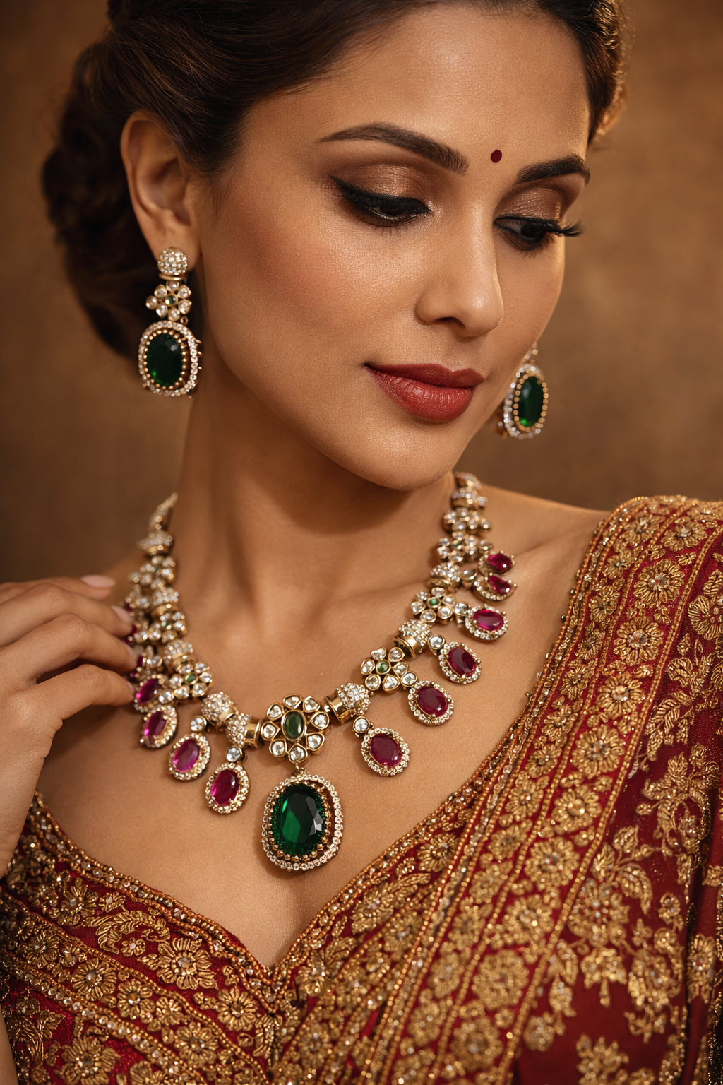 Material: Gold-plated brassStones: Kundan with ruby green workIncludes: Necklace + Matching EarringsAdjustable dori for comfortIdeal for bridal and festive wear