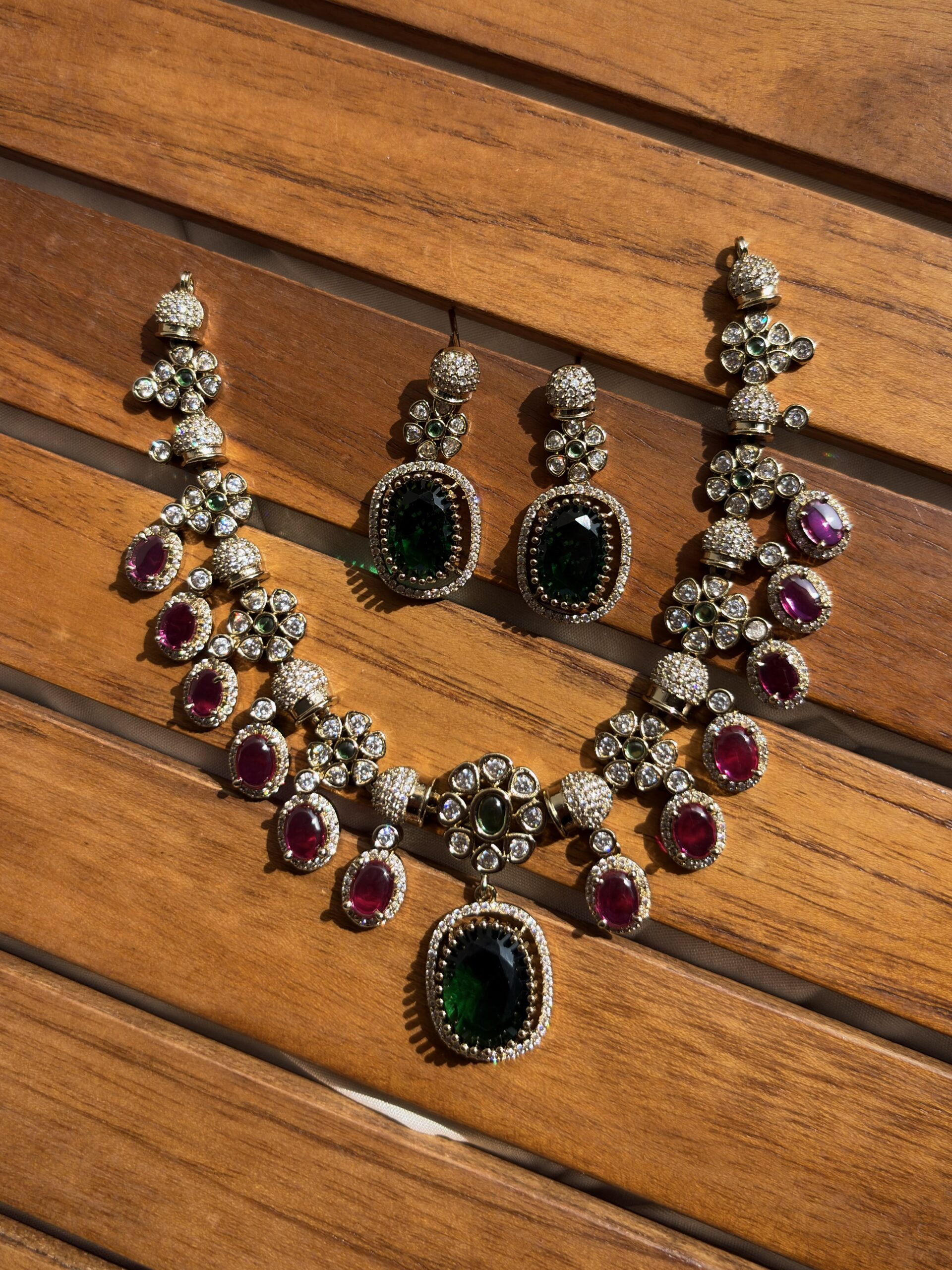 Kundan American diamond craftsmanship, highlighted by pink accents. The matching earrings complete the royal ensemble, making it perfect for weddings, festive celebrations, and cultural events.Blending traditional artistry with modern grace, this necklace set brings timeless beauty to every outfit.
