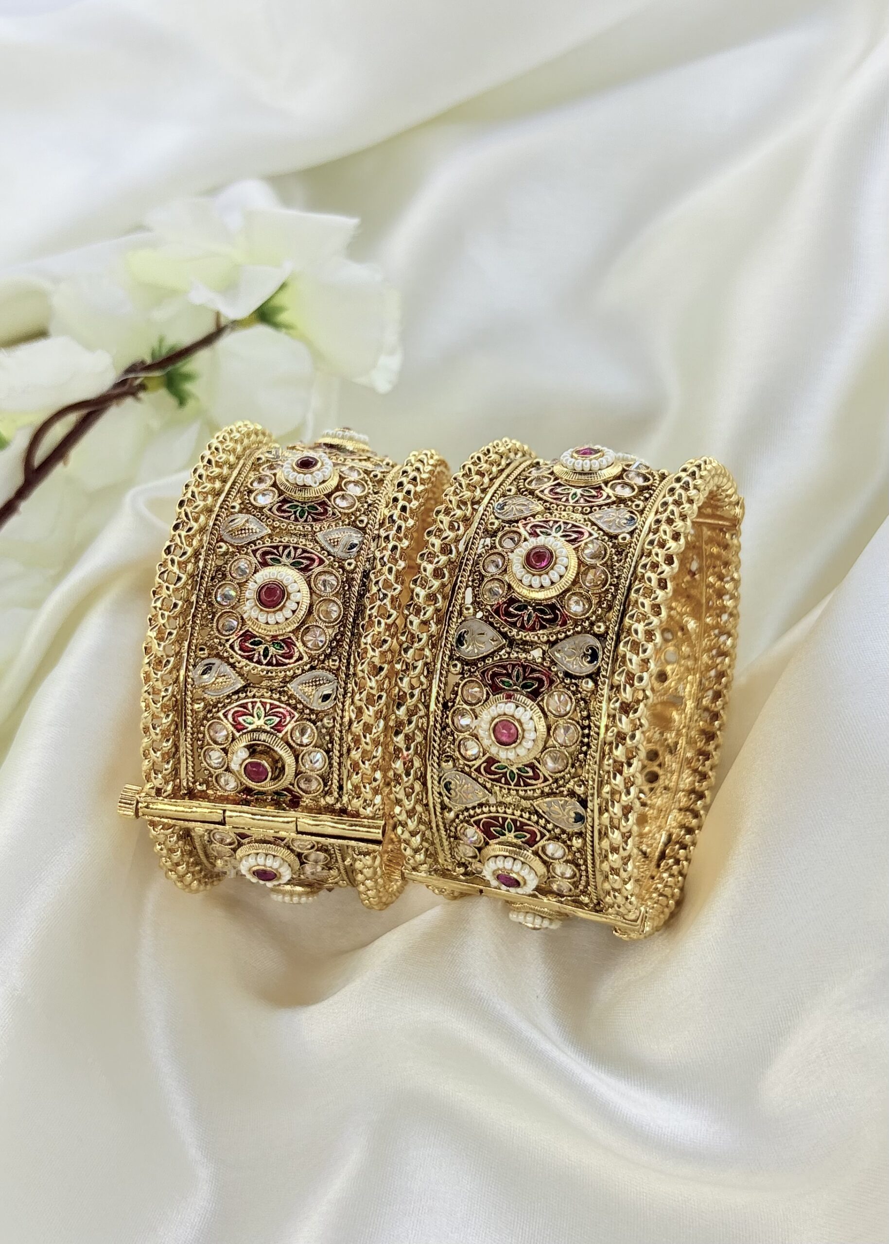 Featuring traditional screw fastening for a secure fit, these bangles showcase rich patterns and long-lasting polish. Ideal for festive celebrations, weddings, or everyday grace, they effortlessly blend royal heritage with modern wearability.