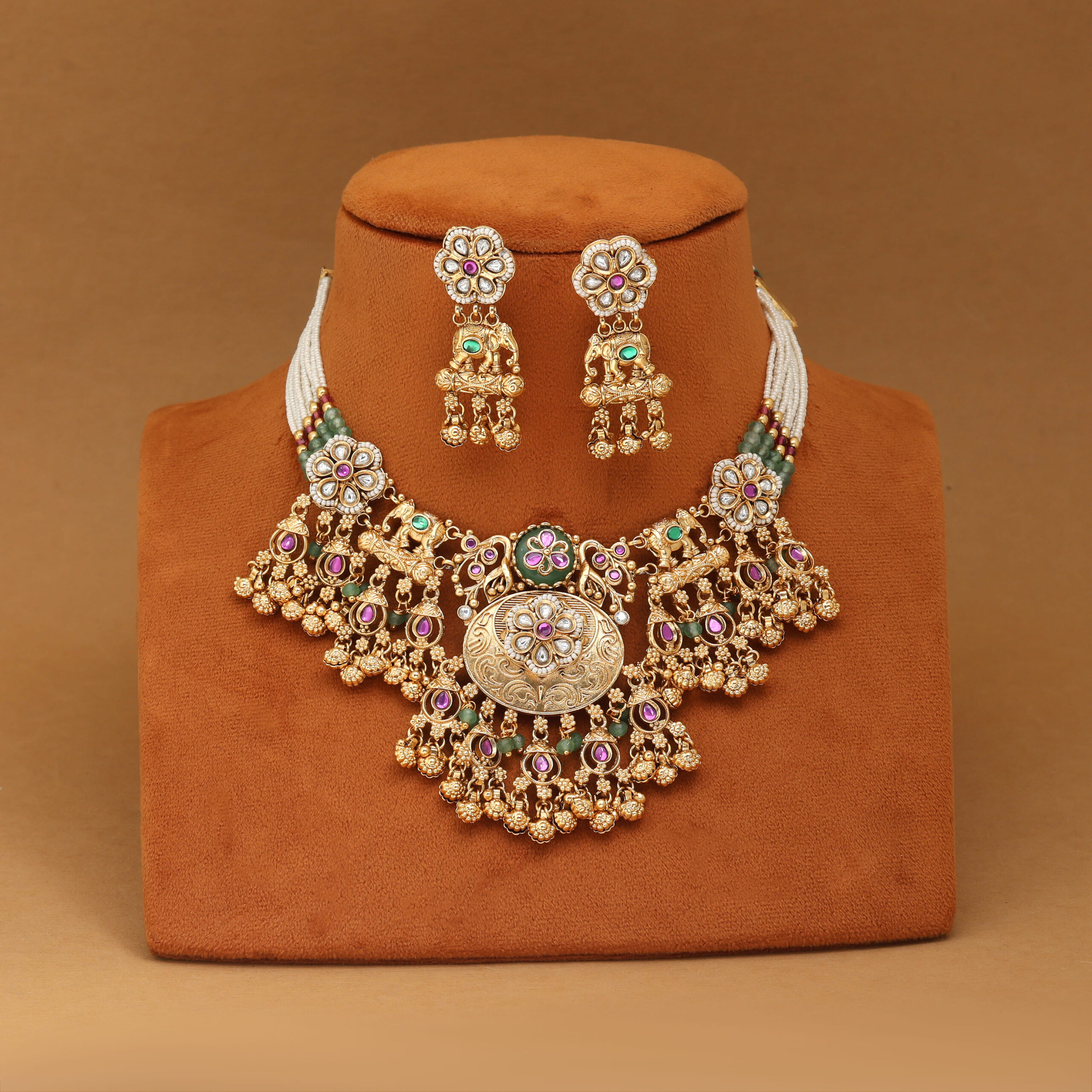 Kundan craftsmanship, highlighted by emerald green and ruby pink accents. The matching earrings complete the royal ensemble, making it perfect for weddings, festive celebrations, and cultural events.Blending traditional artistry with modern grace, this necklace set brings timeless beauty to every outfit.