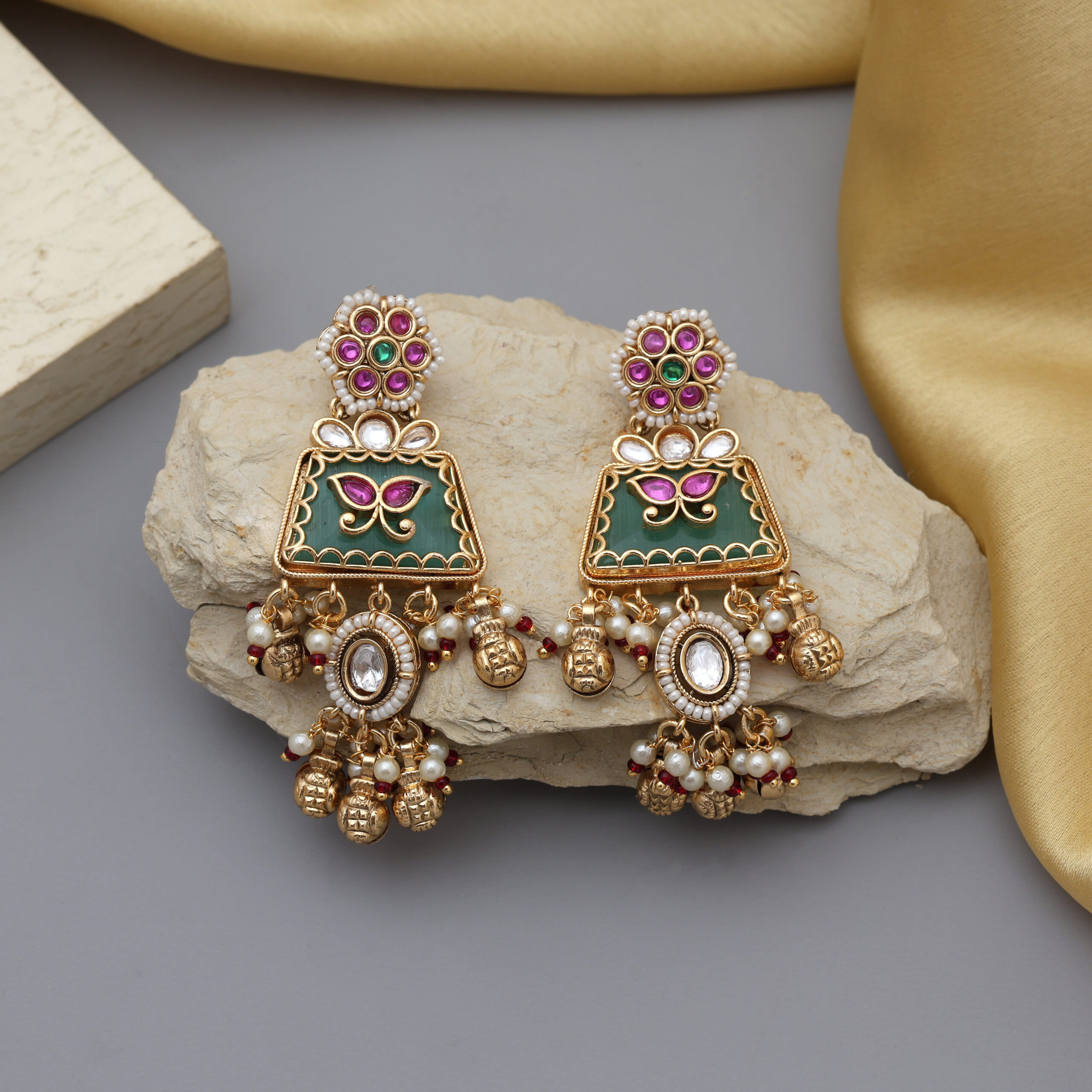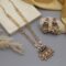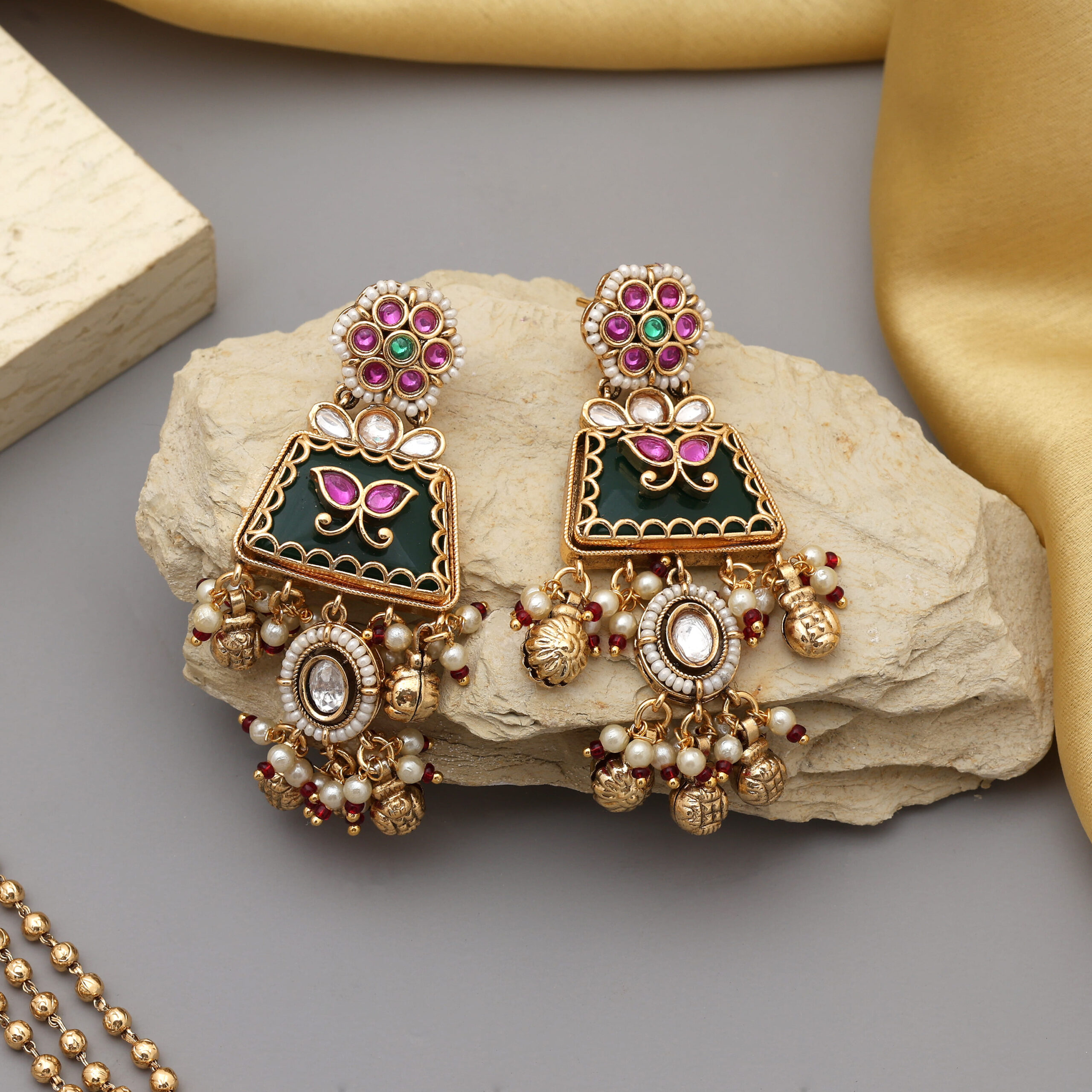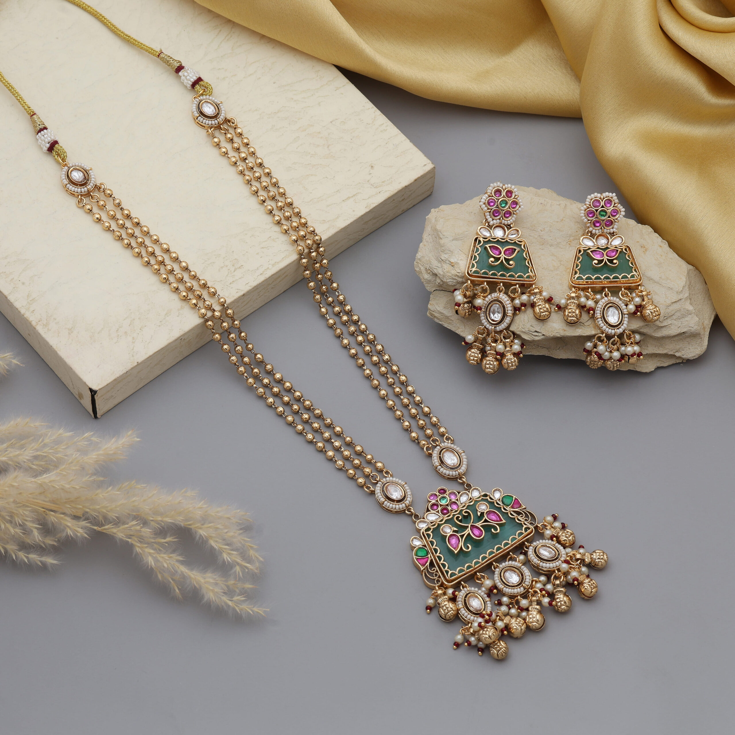 This exquisite piece features three gold-toned beaded layers with intricate Kundan craftsmanship, highlighted by emerald green and ruby pink accents. The matching earrings complete the royal ensemble, making it perfect for weddings, festive celebrations, and cultural events.