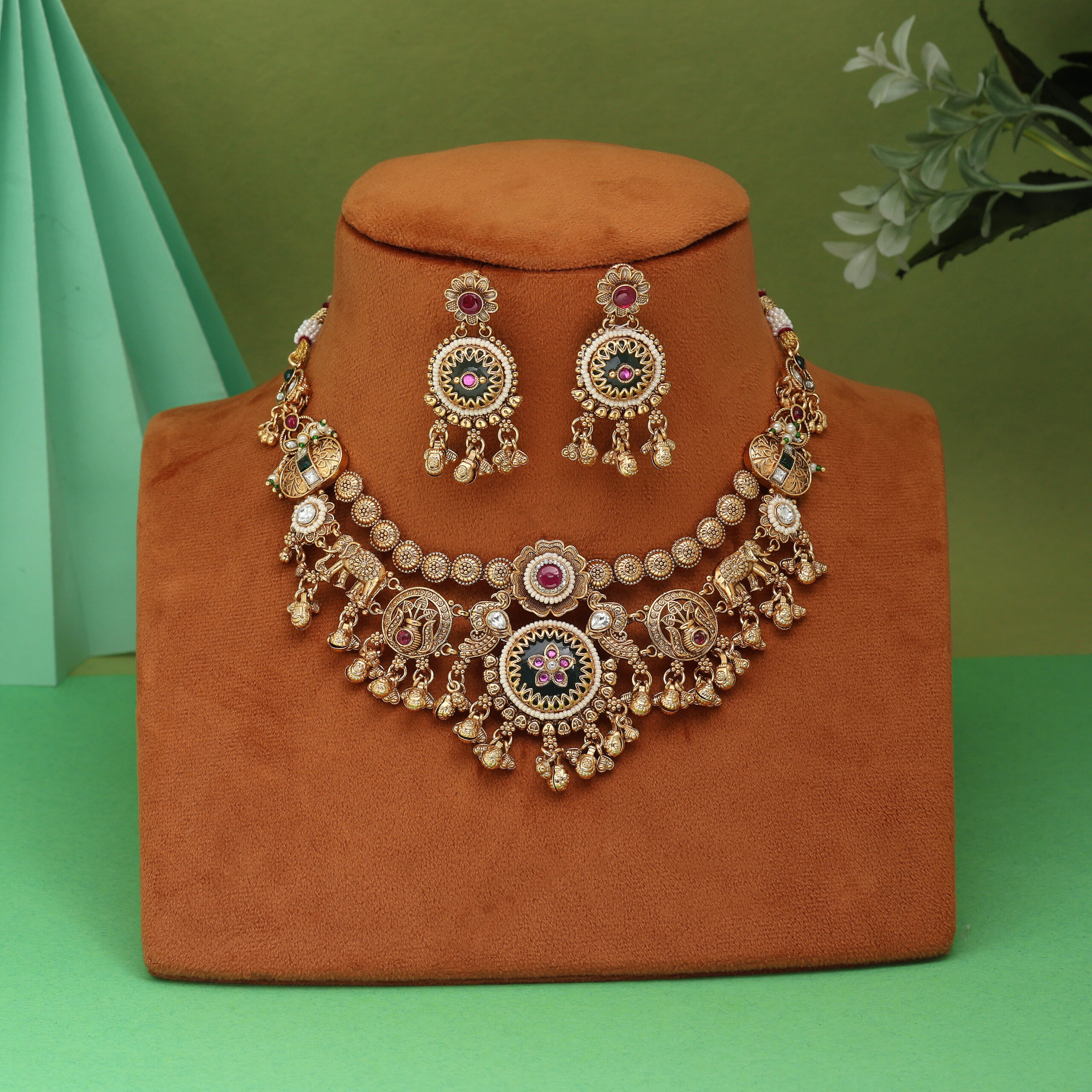 Material: Gold-plated brassStones: Kundan with green and pink enamel workIncludes: Necklace + Matching EarringsAdjustable dori for comfortIdeal for bridal and festive wear