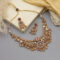 This exquisite piece features three gold-toned beaded layers with intricate Kundan craftsmanship, highlighted by emerald green and ruby pink accents. The matching earrings complete the royal ensemble, making it perfect for weddings, festive celebrations, and cultural events.