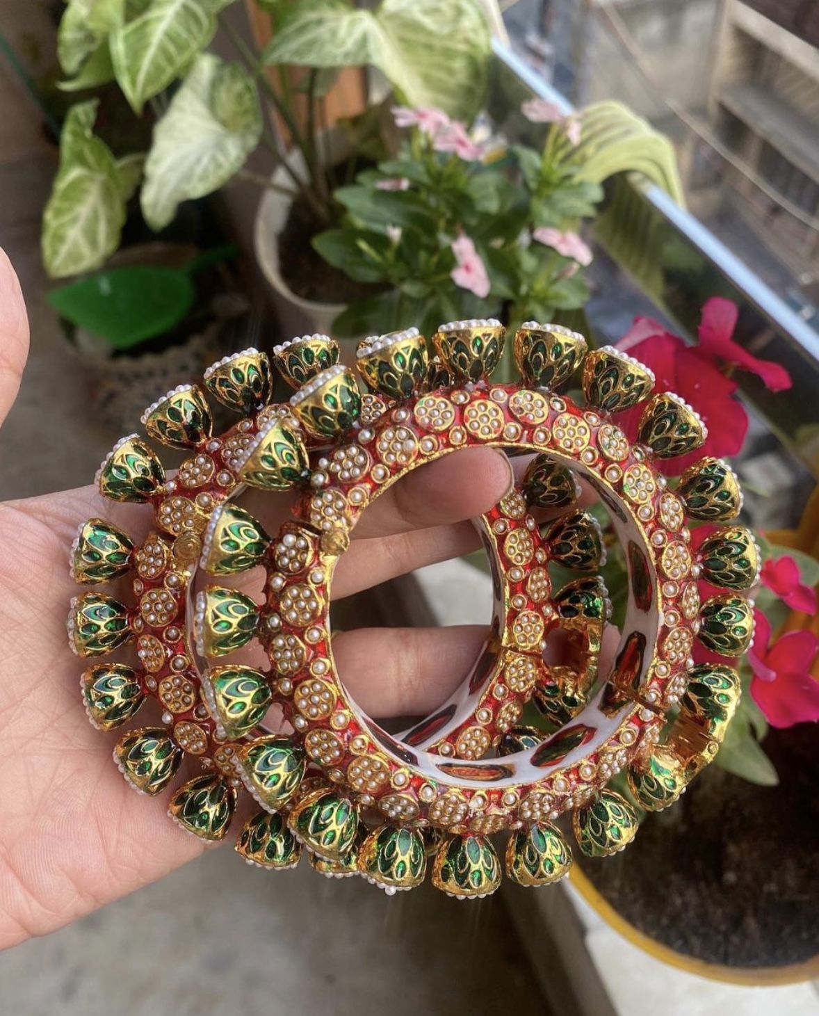 Featuring traditional screw fastening for a secure fit, these bangles showcase rich patterns and long-lasting polish. Ideal for festive celebrations, weddings, or everyday grace, they effortlessly blend royal heritage with modern wearability.