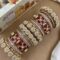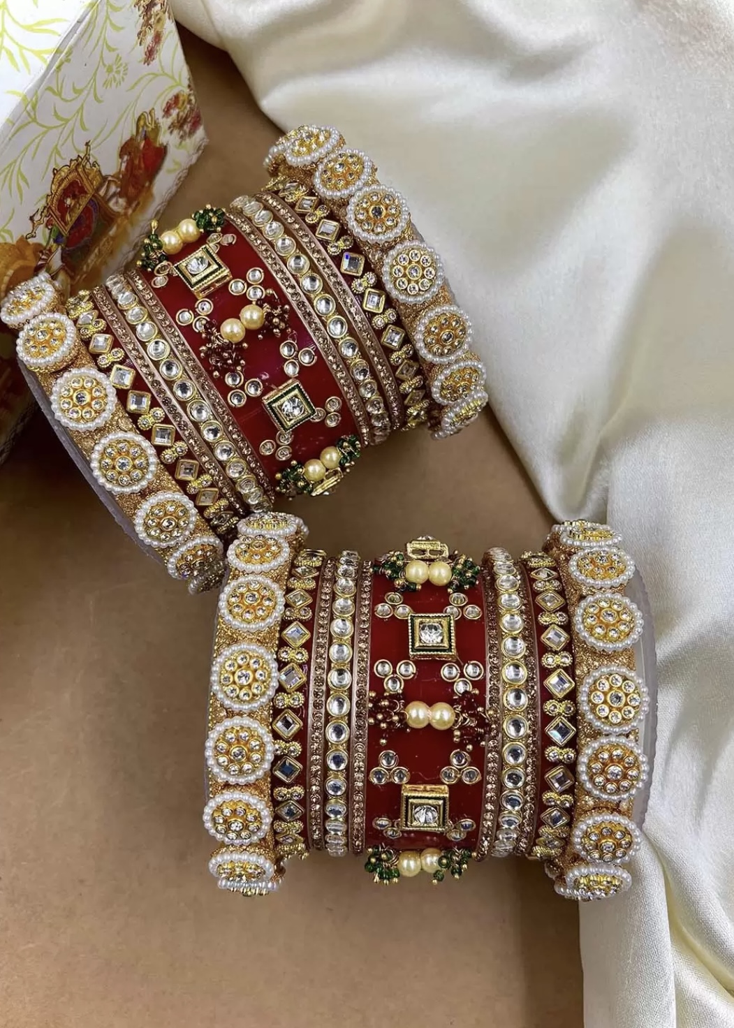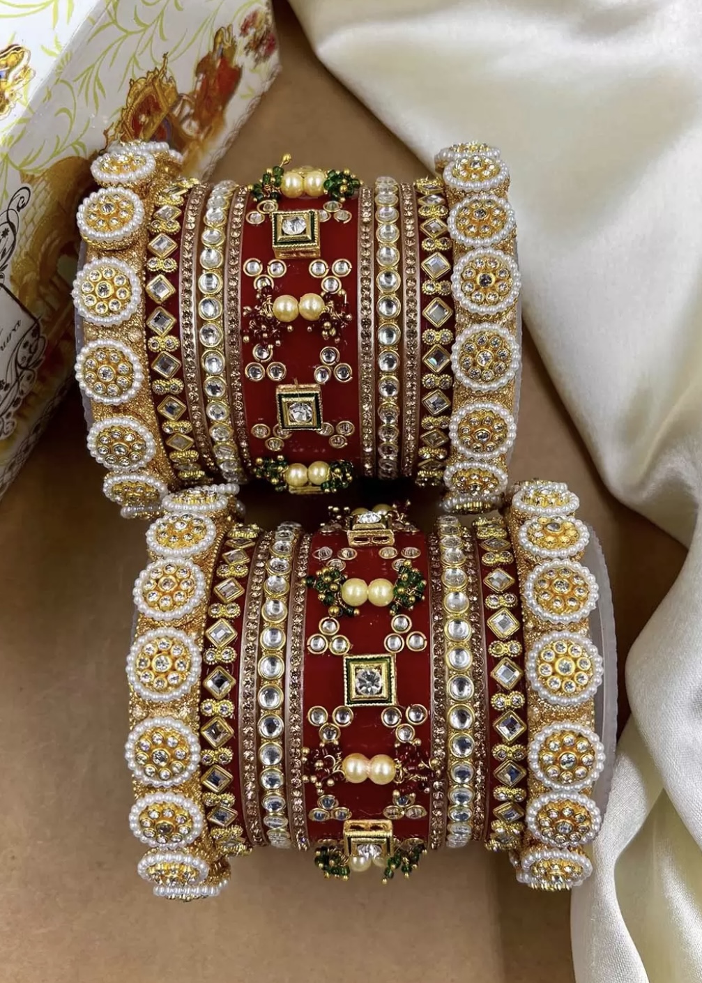 Set of 4 red and gold-plated bangles, each has stone-studded details, secured with slip-on closure Set of 8 pink bangle set, each has stone-studded details, secured with slip on closure