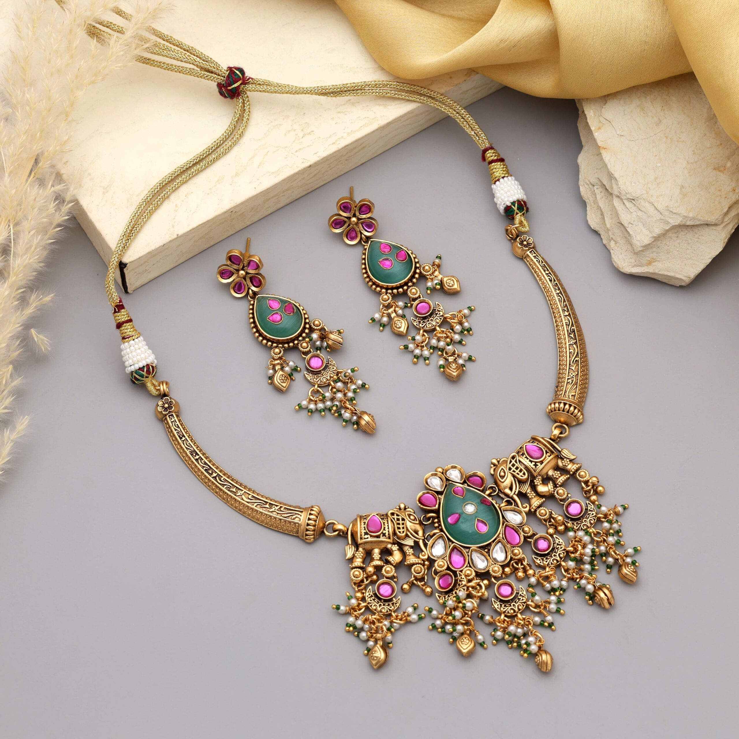 Kundan craftsmanship, highlighted by emerald green and ruby pink accents. The matching earrings complete the royal ensemble, making it perfect for weddings, festive celebrations, and cultural events.Blending traditional artistry with modern grace, this necklace set brings timeless beauty to every outfit.