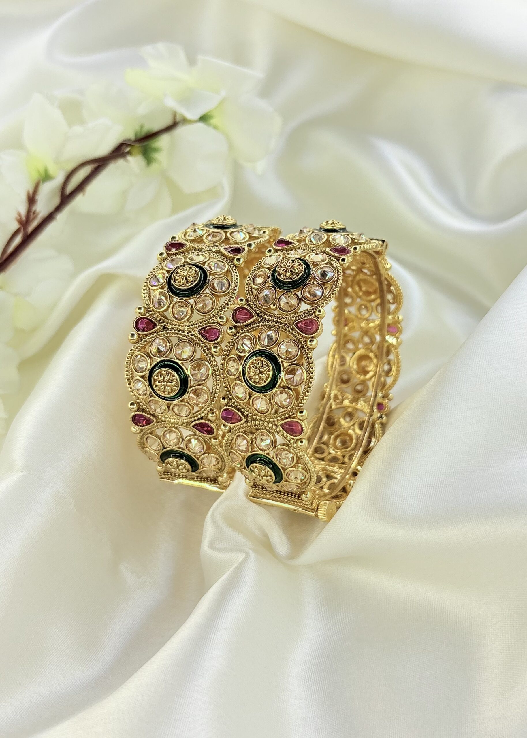 Featuring traditional screw fastening for a secure fit, these bangles showcase rich patterns and long-lasting polish. Ideal for festive celebrations, weddings, or everyday grace, they effortlessly blend royal heritage with modern wearability.